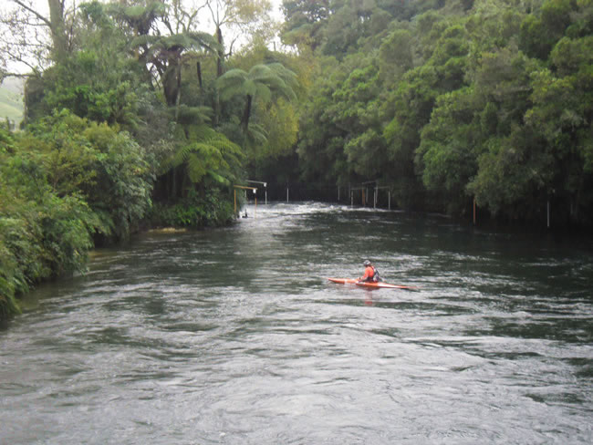 Rotorua to Auckland, New ZealandOn the road again - but not for long. It was the Tutea Annual Kayak Competition and we stopped to watch some of the action, just north of Rotorua near Okere Falls. This is the starting line for the timed obstacle course. Select the photo below to see how they enter the water! Previous | Album | Next |