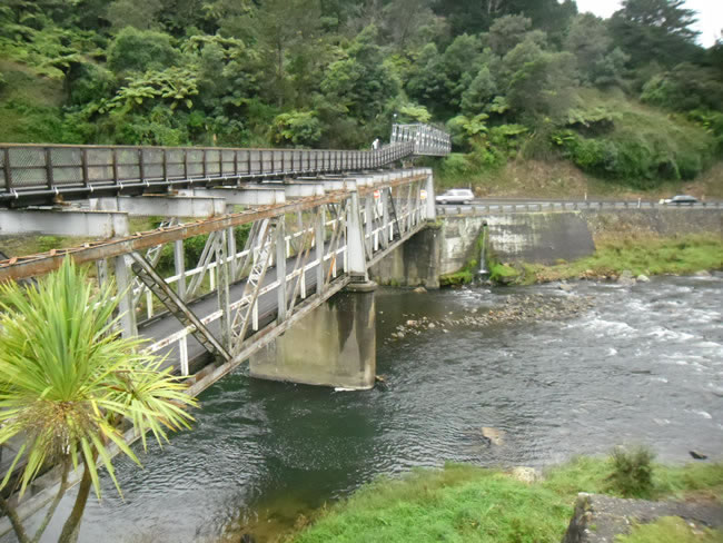 Rotorua to Auckland, New ZealandThis bridge had a roadway running underneath the walkway - interesting! Where the walkway is now there once was the railway. We crossed the Waitawheta River as a car passed beneath us and explored the next lot of ruins. Select the photo below to see the lovely autumn colours further up river. Previous | Album | Next |