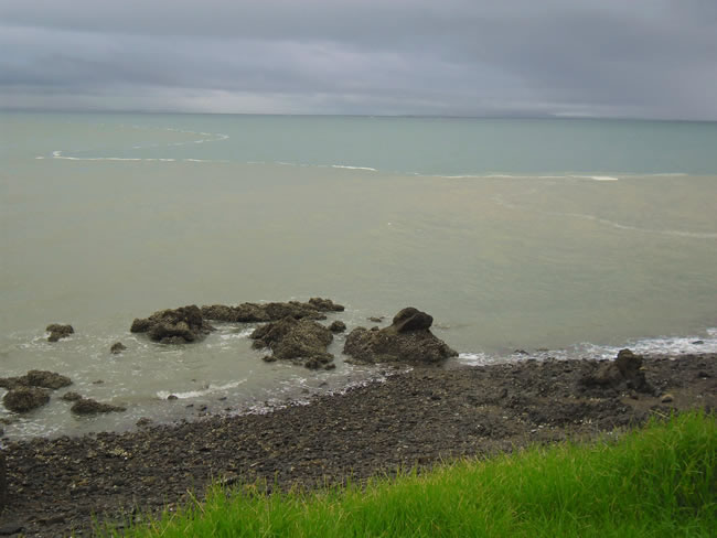 Rotorua to Auckland, New ZealandThe freshwater run off from the rain into the bay (brown) met up with the saltwater (blue) and this distinctive line could be seen extending far out into the Firth of Thames. You can just make out the coastline on the other side where a similar East Coast Road passes through the small towns of Miranda and Kaiaua. That was where we would be heading to camp next. Previous | Album | Next |