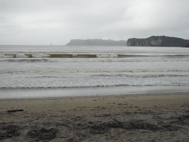Rotorua to Auckland, New ZealandWe continued circumnavigating the Coromandel Peninsula. Beaches around Whitianga had brown waves today with all the floodwater run off. This is the view out into Mercury Bay. It was not all that inviting on such an overcast day. Previous | Album | Next |