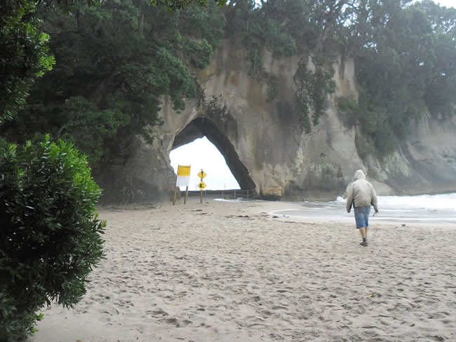 Rotorua to Auckland, New ZealandThe track takes you down to beautiful sandy beaches at Cathedral Cove that are separated by a rock arch. Recent rock falls limited access to the arch. Select the photo below to see the view from inside the archway. Previous | Album | Next |