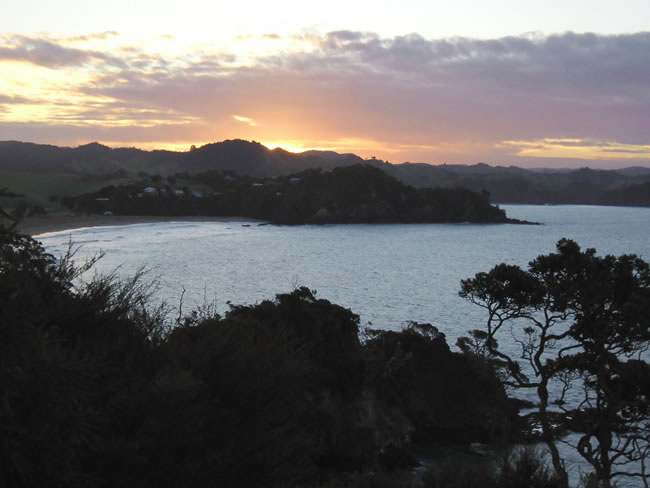 Auckland to Cape Reinga, New ZealandWe had a quick stop at the lookout with views of Whale Bay, Woolleys Bay and Sandy Bay and managed to catch the sunset colours before they disappeared. It was time to start looking for a place to stay the night. The next DoC (department of conservation) camp site north of here was at Whananaki on Otamure Bay. Previous | Album | Next |