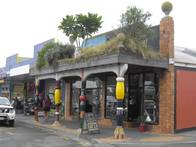 Auckland to Cape Reinga, New ZealandIt is not only the toilets in Kawakawa but a lot of other stores have got into the spirit. I loved this Grass Hut gift shop with the plants growing off the roof. Just as I am taking this photo, a train came down the main street amongst the pedestrians and cars! Select the photo below to see the train. Previous | Album | Next |