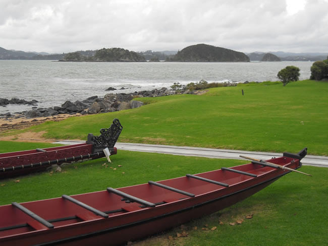 Auckland to Cape Reinga, New ZealandNot much further north and we were in the Bay of Islands region - 144 islands I am told. We are now only 60 km north of Whangarei but it has taken us a whole day to get here with all our stops and walks. Unfortunately it was quite overcast and the views not as beautiful as they could have been on a sunny day. We visited Waitangi and stopped first at the war canoes (waka). Select the photo below to see the rest of these canoes and view of the area. Previous | Album | Next |