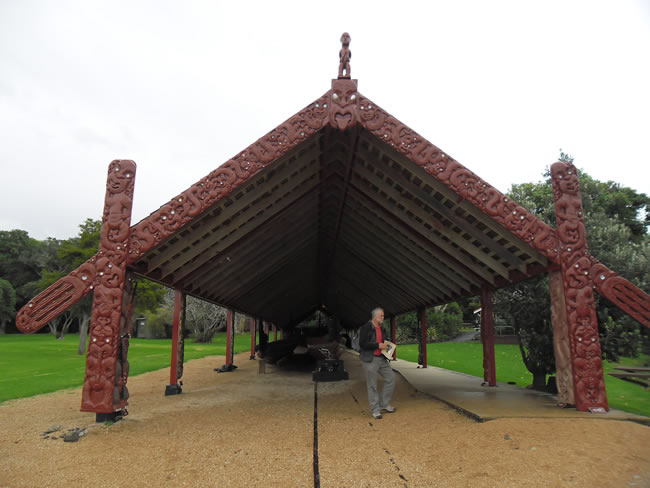 Auckland to Cape Reinga, New ZealandNgatokimatawhaorua is named after the great canoe of Kupe, traditional Polynesian ancestor of the Maori people. It is said to be the largest war canoe in the world and is housed here in Waitangi Grounds. The carvings on the canoe and also on the wooden structure where it is housed are very impressive. Previous | Album | Next |