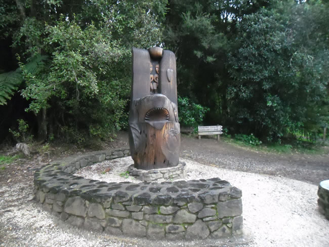 Waitakere Ranges to Auckland, New ZealandIt had been a BIG day so we looked on our map for a camp site somewhere back along the Huia Bay Road. This one at Karamatura Nature Reserve looked OK and had an interesting Maori shark carving (pou) but we decided to continue another couple of km to one called Barn Paddock. It sounded a bit different. Previous | Album | Next |