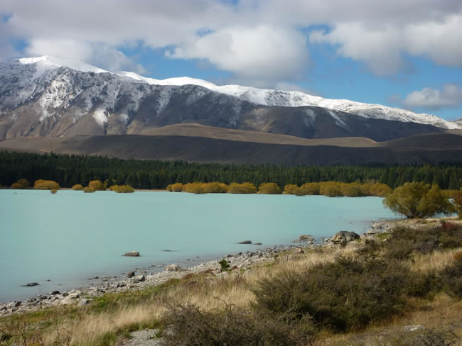 Inland Scenic Route From Rakaia River to Lake TekapoWe crossed the Selwyn River at another of the one lane bridges that we were surprised to see many of in New Zealand. There are no one land bridges left in Australia on main highways but I guess we have a lot more land to play with. We arrived at Lake Tekapo and were amazed at the colour of the water. The finely ground rock in the glacial melted waters give Lake Tekapo a beautifully unique turquoise color. Select the photo to see more of Lake Tekapo. Previous | Album | Next |