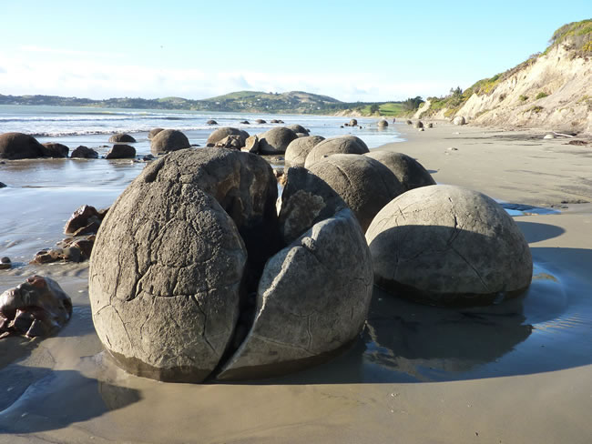 Dunedin to Catlins to BluffThe Moeraki Boulders are the most perfect example of their kind found anywhere in the world. They consist of mud, fine silt and clay, cemented by calcite. The rock is riddled with large cracks that radiate outward from a hollow core lined with calcite crystals. They were formed in ancient sea floor sediments by a process similar to the formation of oyster pearls, where layers of material cover a central core. For the oyster, this core is an irritating grain of sand. For the boulders, it was a fossil shell, bone fragment, or piece of wood. If you visit this area make sure you come near low tide to get the best view of the boulders. Select the photo below to see more of this area. Previous | Album | Next |
