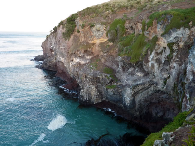 Dunedin to Catlins to BluffWe saw an albatross circling above this blue ocean further out to sea from these cliffs. The wing spans can be up to 3m but the one we saw was not that big. The Bull Kelp wafted around in the waves below the cliffs, firmly anchored to the rocks, with air bubles in its blades to keep it afloat. Select the photo below to see more of this area. Previous | Album | Next |