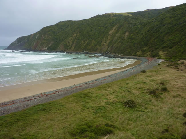 Dunedin to Catlins to BluffAs you can see it is still overcast with light rain falling on and off. The yellow-eyed penguin nests are well disguised in amongst the grass here at Roaring Bay. They are one of the rarest penguins in the world so you need to be discreet and not approach them so the track does not go down to the beach but ends here at the bird hide. We were lucky to spot one nest not too far from the hide. Select the photo below to see it. Previous | Album | Next |