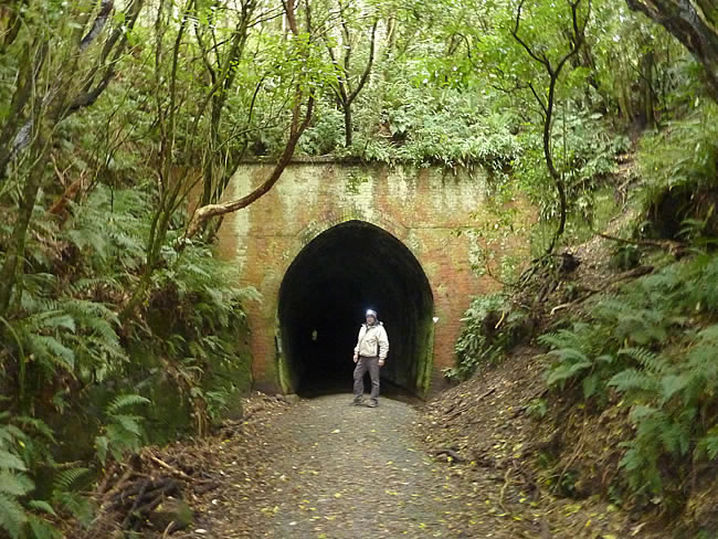 Dunedin to Catlins to BluffAbout 3 km east of Owaka is Tunnel Hill, which is a historic reserve featuring the 246-m-long tunnel, once the most southerly railway tunnel in New Zealand. Completed in 1893 it was the most prominent feature on the Catlins branch railway line that ran between Balclutha and Tahakopa serving the southernmost parts of the South Island. Timber reserves dwindled after the 1950s and the railway declined along with the sawmilling industry until it closed in 1971. We grabbed our headlamps and did the short walk from the car park through the tunnel and back along the river bank. Select the photo below to see the other end of the tunnel as we emerged again. We have found the headlamps really useful in the South Island as we have come across a number of caves and abandoned tunnels worth exploring. Previous | Album | Next |