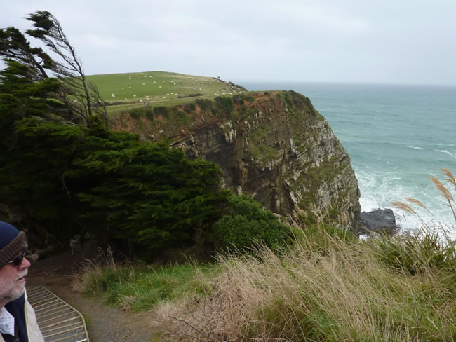 Dunedin to Catlins to BluffWe continued along the Southern Scenic Route and stopped next at Jack's Bay. It was still overcast windy and drizzling rain at times. Probably not the best days for views but it was spectacular even so. This area was named after the Maori chief Tuhawaiki who was known to European settlers as Bloody Jack. Access to Jack's Blowhole is across private property with a number of stiles along the track to allow you to cross from one paddock to the next. The Cliffs didn't bother the sheep at all, in fact they seemed to like sitting as close to the edge as possible!!!! Select the photo below to see those sheep in the photo up closer. Previous | Album | Next |