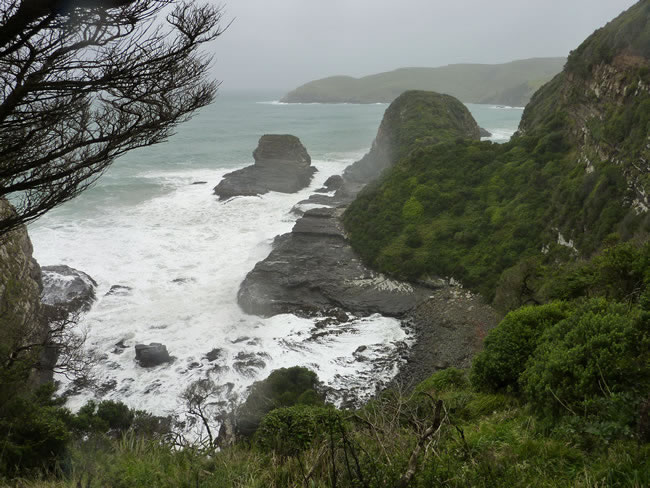 Dunedin to Catlins to BluffWe had to imagine how beautiful these Catlins cliffs and bays would be on a nice sunny day as even on this overcast rainy day it was quite impressive. As we continued south along the Scenic Route we took a number of short side trips to various holiday villages, many beaches and cliffs that were remarked upon by Captain Cook on his first exploration voyage in 1770. Previous | Album | Next |