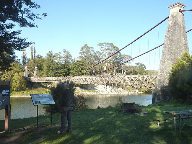 Invercargill to Fiordland to Milford, New Zealand TripAs we crossed the Waiau River we spotted the Clifden suspension bridge which is a significant engineering achievement and one of the longest bridges in the South Island. It is an impressive structure built in 1899 and held together with steel cables, totara and Australian hardwood. The concrete towers are made to look like stone. The Waiau River is of particular significance to the Ngai Tahu so a 'Deed of Recognition' has been placed at this site. Select the photo below to see more of this area. Previous | Album | Next |
