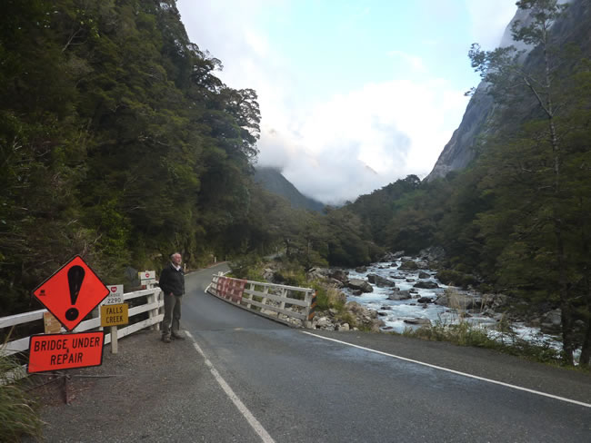 Invercargill to Fiordland to Milford, New Zealand TripHeavy rains take their toll especially on the single lane bridges which are a common site in New Zealand. This one seemed OK apart from the railing so we continued on towards the Main Divide in the Southern Alps. Previous | Album | Next |