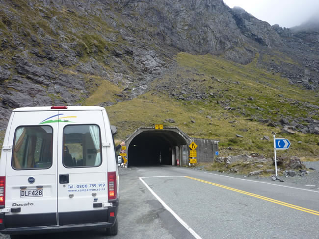 Invercargill to Fiordland to Milford, New Zealand TripWe reached the east entrance to the Homer Tunnel which is a single lane tunnel opened in 1954. This tunnel, links Milford Sound to Te Anau, by piercing the Main Divide of The Southern Alps at the Homer Saddle. It runs 1270 m at approximately a 1:10 gradient down to the western portal. Select the photo below to see the other end of the tunnel. Previous | Album | Next |