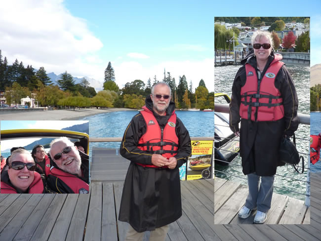 Queenstown to Haast Pass, New ZealandWe got ourselves a camp site in the caravan park just 5 minutes walk from the town centre and Lake Wakatipu's shore. We put the washing on, plugged in everything that needed recharging, filled up with water, had lunch and booked a spot on the next available JetBoat ride. Select the photo below to see our view from the jetboat. Yes, I decided to take my camera and purse even though they kept advising us to leave EVERYTHING behind in their safe keeping. |