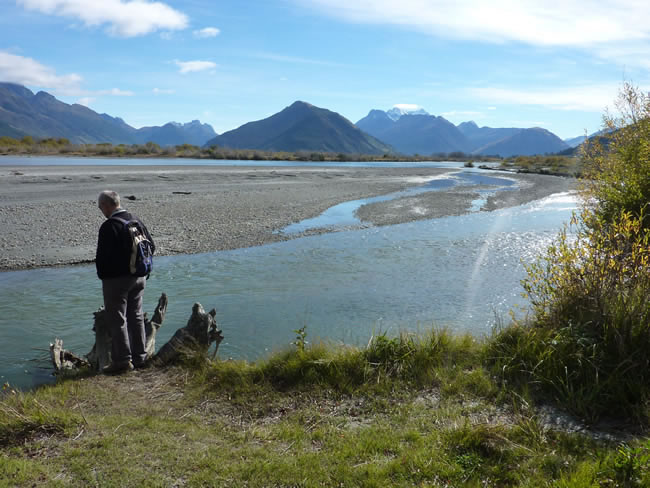 Queenstown to Haast Pass, New ZealandWe decided to do the Glenorchy Lagoon walk which gave us views of the Rees and Dart rivers. They are both typical braided rivers and fed by the snow and ice melting in the surrounding Forbes Mountains. Select the photo below to see another great view of the river with the mountains. Previous | Album | Next |