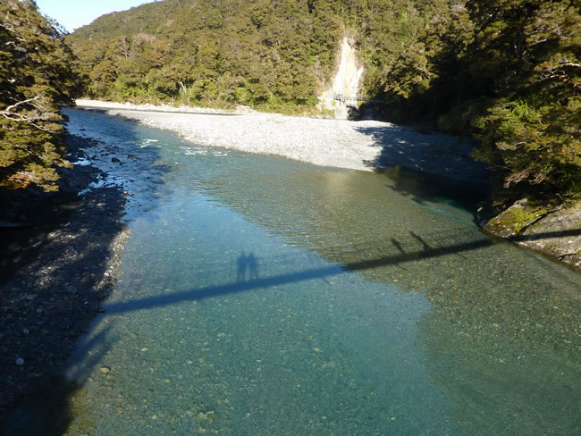 Queenstown to Haast Pass, New ZealandWe are heading back from the Blue Pools walk which is listed as one of the 101 Must-Do's for Kiwis. That's our shadows! Select the photo below for a closer view and to see how beautiful the water is. It makes you want to jump in for a swim EXCEPT it is so cold. Previous | Album | Next |
