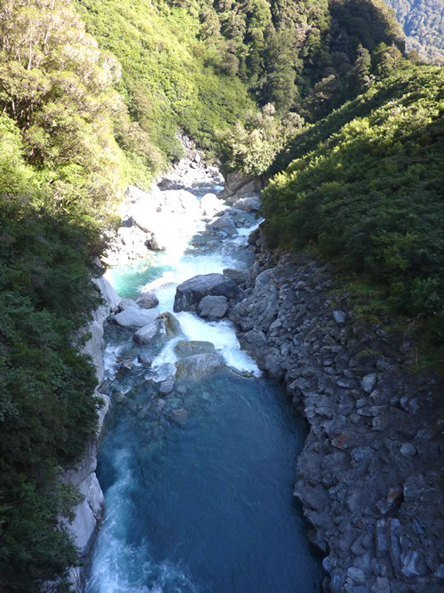 Queenstown to Haast Pass, New ZealandJulius von Haast who played an important role in opening up the region named this river. This is the downstream view of the Haast River taken from the Gates of Haast bridge towards the raging torrent below. Select the photo to see the upstream view. Previous | Album | Next |