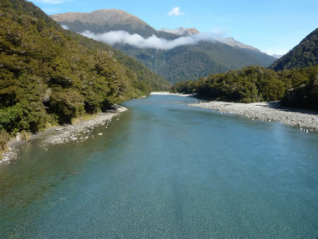 Haast to Greymouth, New ZealandLooking back towards Haast Pass from the Pleasant Flat Bridge you can imagine the fishermen might catch trout and perch here in the Haast River. The open season runs from 1 October – 30 April. This tranquil clear blue river is quite a contrast to the raging torrent we saw just an hour ago from the Gates of Haast Bridge! Previous | Album | Next |