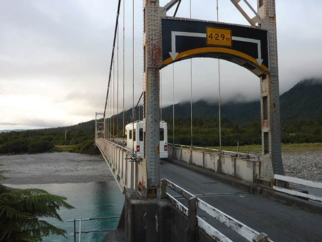 Haast to Greymouth, New ZealandWe crossed the one lane Karanganua Suspension Bridge - not sure what trucks do if they are wider than 4.29m?! Of all the suspension bridges still being used in New Zealand, this one has the longest main span of about 130 meters. The water of the Karanganua River is generally a turquoise colour from the continuous snow melt. Select the photo below to see more of this area. Previous | Album | Next |