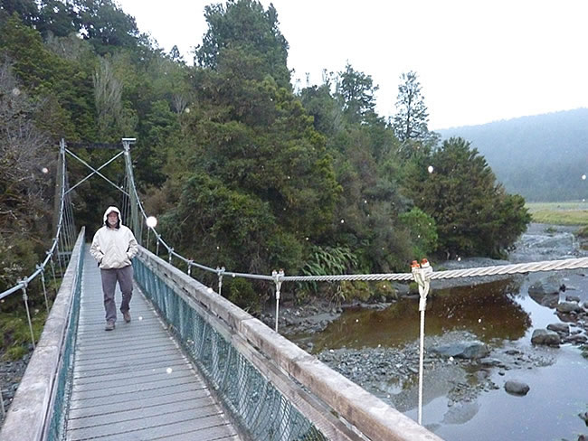 Haast to Greymouth, New ZealandIt was getting late as we arrived at Lake Matheson 6km west of Fox Glacier Township. We had just enough light to do the shorter walk (30 mins return) to the jetty view point starting at the small suspension bridge. Select the photo below to see the only visitors to appreciate this weather! These were a mating pair - the male and female look quite different to each other. Previous | Album | Next |