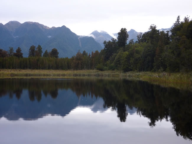 Haast to Greymouth, New ZealandLake Matheson formed as Fox Glacier retreated back toward the mountains over 14,000 years ago. The calm dark water reflects Mt Cook and Mt Tasman. Wouldn't this be a perfect view at sunrise (or sunset) if it wasn't so cloudy? Select the photo below to see more of this area. Previous | Album | Next |