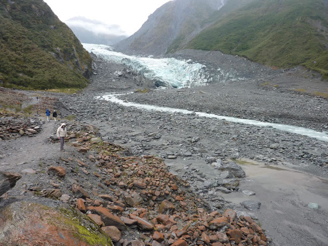 Haast to Greymouth, New ZealandThe Fox Glacier Valley Walk is 1 hour return and the track takes you to the Glacier terminal ice. They don't allow you to go right up to touch the ice or onto the glacier without a guide but you can see it all pretty well from the track so we were happy with that. The red and green lichen on the rocks added a bit of colour to the otherwise grey morraine. Select the photo below to see more of this area. Previous | Album | Next |