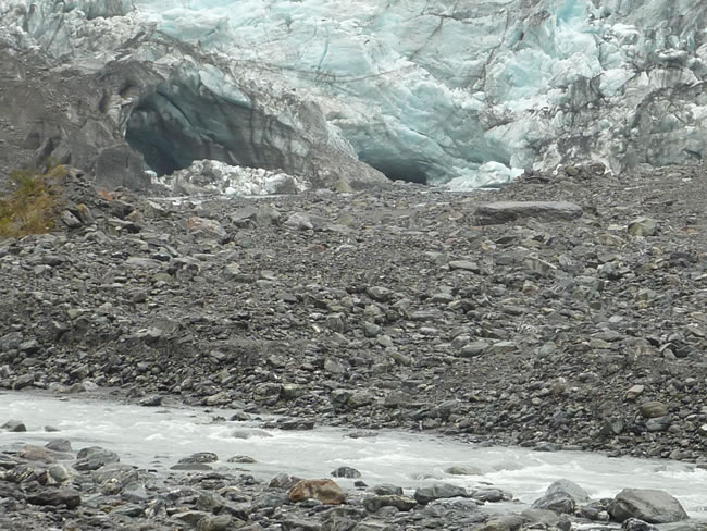 Haast to Greymouth, New ZealandYou can see two 'caves' in the terminal face of Fox Glacier. Two men were crushed under 100 tonnes of ice in 2009 when the face of the glacier collapsed. They had apparently gone over the safety barriers to get a better look at the caves and terminal face which was weakened by the melt water running out under the glacier. Select the photo below to see this area up closer. Previous | Album | Next |