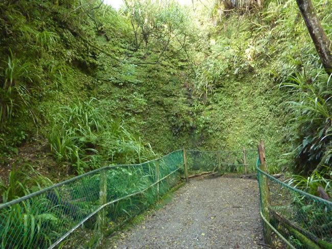 Haast to Greymouth, New ZealandOn the way out of Hokitika there is a Glowworm Dell just off the main road, 200m walk into a small fern and moss covered gorge. We investigated, but of course you can't see them in the daylight. I am sure it would be magical at night. We found out though (information sign) that they are the larval stage of the fungal fly and they make the glow through their tails using bioluminescence. That didn't sound so romantic! Previous | Album | Next |