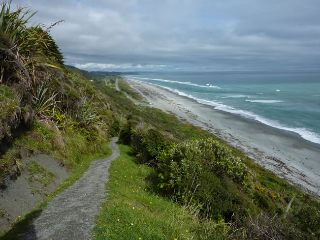 Haast to Greymouth, New ZealandJust north of Greymouth is the Point Elizabeth Coastal Track, maintained by the Department of Conservation (DOC). We parked near the beach (yes that is our camper down there) and started hiking up and up and up! Select the photo below to see the rocky Cobden's beach where we had lunch and fossicked for greenstone or jade (pounamu). It was a good spot to camp but we had more to see that day. Previous | Album | Next |