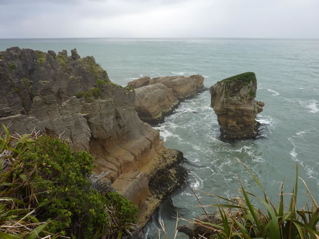 Punakaiki to GoldenBay, South Island, New ZealandWe watched the bull kelp washing back and forth around the base of the rocks. According to the information I read "traditional pōhā (bull kelp bags) are still used today by South Island Māori to preserve many types of food". They gather the long broad blades of the kelp and prepare them so that food, such as Weka/wood-hens and mutton birds can be safely kept for up to two years! Select the photo below to see more of this area. Previous | Album | Next |