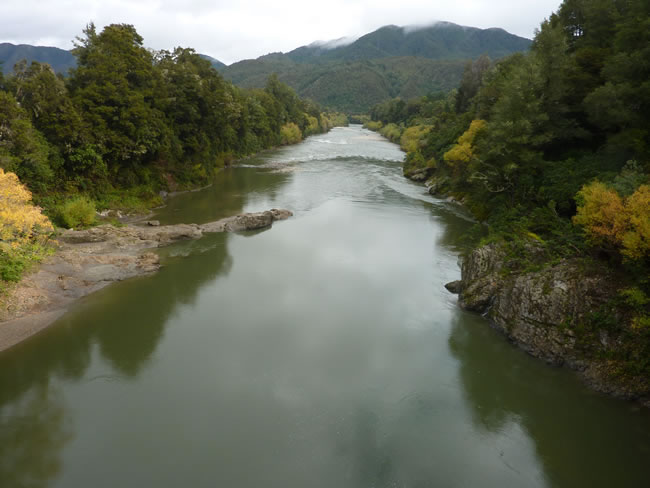 Punakaiki to GoldenBay, South Island, New ZealandWe spotted a sign further along the road indicating the fault-line Upthrust where the earth's surface cracked during the Murchison earthquake. One side of the crack rose over 13 feet. We left the very scenic Upper Buller Gorge at O'Sullivans bridge where we crossed the Buller River once again and took photos up and down the river. We were now about to enter dairying country. Select the photo below to see the view from the other side of the bridge. Previous | Album | Next |