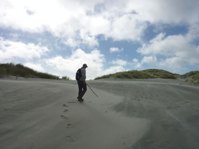 Farewell Spit to Foxton Beach, New ZealandThey find seals along this spit and sometimes there are mass strandings of whales here. But mostly there are birds, over 90 species call this home, some only for parts of the year before they migrate to places like Alaska. Often fur seals come up on the beach here too but we didn't see any today. Select the photo below to see the view towards the far end of the spit. Previous | Album | Next |