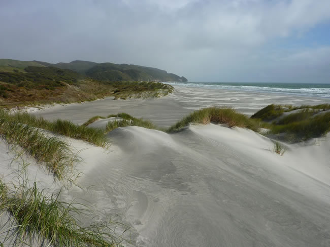 Farewell Spit to Foxton Beach, New ZealandAs we looked back down the spit we could see the rain coming and the wind was picking up. We zipped up everything we could and were very thankful we had sunglasses on to protect our eyes from the blowing sand. We put our heads down, hats on very tight and leaned into the wind and rain as we trudged up the beach feeling like we were antarctic explorers making our way through a snow storm. It was an unbelievable experience especially since only minutes before it was a pleasant day! Once we got up to the end of this beach magically the rain and wind stopped. Previous |Album | Next |