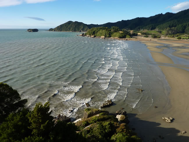 Farewell Spit to Foxton Beach, New ZealandWainui Bay is the last stop before Abel Tasman National Park. Taupo Point, seen here in the distance, has an old Pa (Maori Fort) that you can take a 1 hour walk to from Wainui Beach (another for next time). We watched some 'learner' wind surfers making the most of the low tide to get the hang of the sport. Unfortunately one got blown into the rocks and had to be rescued by his friends. This is a very peaceful part of New Zealand with no shops and few people. Previous | Album | Next |
