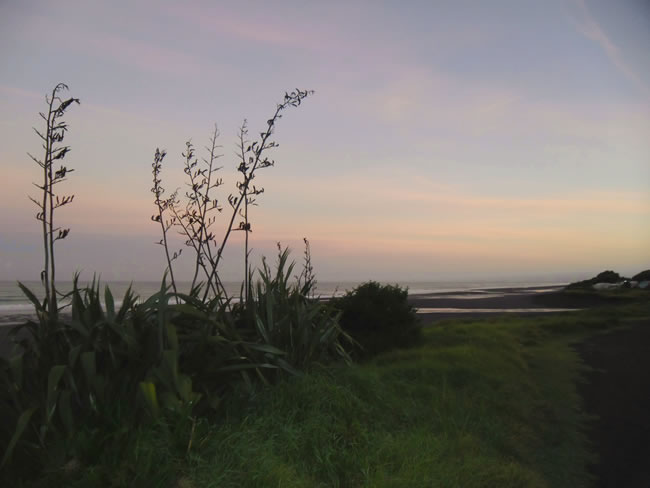 Wanganui to Lake Taupo, New ZealandNot far north of New Plymouth, near Mokau, we decided it was time to set up camp for the night (campsite 19) with nice views of the black sand beaches. We were just in time for sunset drinks & nibblies, although it was too cold to stay long outside once that sun went below the horizon! Previous | Album | Next |