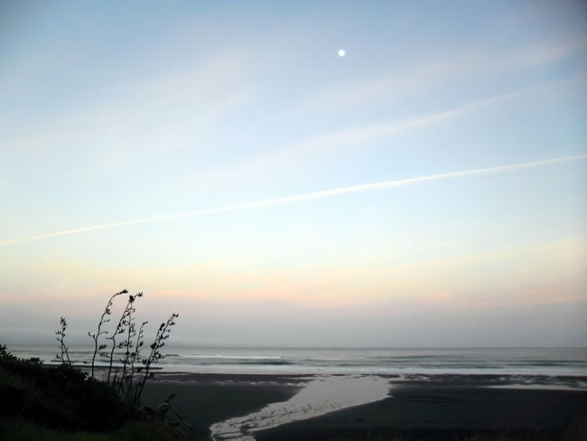 Wanganui to Lake Taupo, New ZealandNext morning's sunrise colours at Awakino Beach... the moon was still up as the early morning planes tracked white streaks across the coloured sky. Awakino is a river mouth sandy beach located at the mouth to the Mokau River. It is a favourite with surfers. Previous | Album | Next |