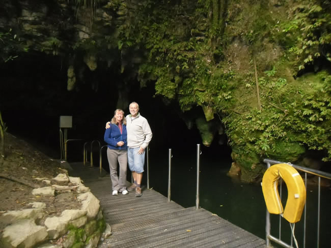 Wanganui to Lake Taupo, New ZealandWe headed north to Waitomo to visit the various caves and to do the glowworm tour. We got there before the tour buses and were lucky enough to get the first boat tour of the day with only 4 of us on it. As their was plenty of room, the guide got us to lie down across each bench seat so we could easily gaze at the cave roof while she told us all about it. Just magical! No photos sorry. This is taken just outside the cave exit. You can't quite see the boat behind us in the darkness. Select the photo below to see more of this area. Previous | Album | Next |