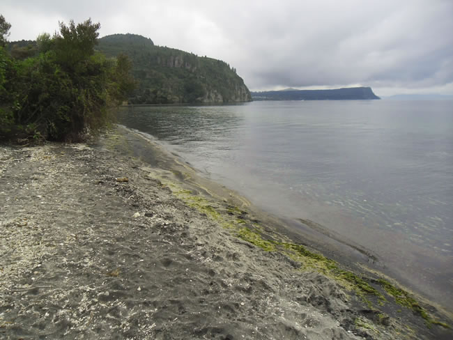 Wanganui to Lake Taupo, New ZealandNext morning we headed back to the main road and on towards Lake Taupo. The lake is not its usual beautiful blue colour thanks to the terrible weather we were still unable to shake off. Driving down the western side of the lake it became obvious we were entering the thermal regions of New Zealand. We stopped at some of the beaches made up of volcanic black sand and pumicestone. All around the countryside we started spotting steam venting out of the ground. Select the photo below to see more of this area. Previous | Album | Next |