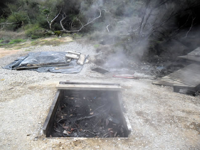 Wanganui to Lake Taupo, New ZealandWe stopped near the end of the track to see what a group of people (Maori) were doing and it seems they STILL use this area for cooking. They put their food in these 'ovens', cover them over and come back later or else spend some time relaxing in the hot spring baths while they wait. Great idea! Previous | Album | Next |