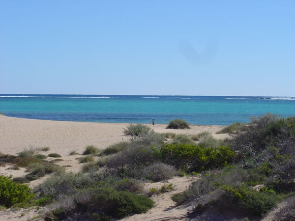 Ningaloo Reef, Cape Range National ParkThe waves break on the outer edge of the reef and you can sometimes see whales swimming along outside the wave break. Inside the waters are calm. Here at Tulki Beach it is quite a distance out to the wave break. Previous | Album | Next |