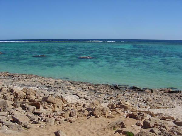 Ningaloo Reef, Cape Range National ParkHere at Oyster Stacks the waves breaking on the reef edge are quite close to shore. We found this was the best snorkelling spot - there are 3 'stacks' that stick out of the water which are covered with corals (and oysters) and hundreds of colourful reef fish swim around them. I didn't have an underwater camera so you will just have to be believe me that it was easily as good as the Great Barrier Reef and much more accessible. Not only the 3 stacks but ALL of the dark patches are corals. Nobody was snorkelling this day as it was quite windy which made the water choppy. Previous | Album | Next |