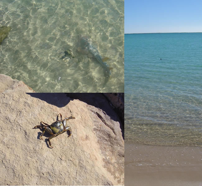 Ningaloo Reef, Cape Range National ParkWe couldn't believe the amount of wildlife we came across on our walk along the beach and rocks from our campsite at Tulki. On one walk we saw 4 shovel nosed sharks in the shallow waters close to shore and also off the rocks. We saw 3 turtles poke their heads up 20m off shore and then quickly duck away once they spotted us. There were many small crabs that scurried under rock ledges as soon as we came near and schools of small fish skimmed along the waters edge. Previous | Album | Next |