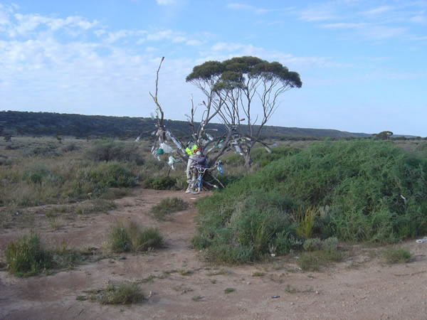 Eyre Highway, NullaborThere is much more vegetation than I expected on the Eyre Highway but you can still get bored on a long trip like this. We passed a tree decorated with shoes then another decorated with other assorted items. Previous | Album | Next |