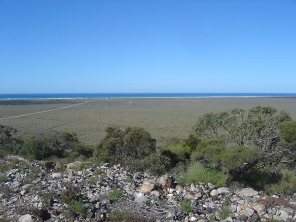 Eyre Highway, NullaborThe road comes in much closer to the coastline at Eucla just 13km from the WA - SA border. You can see the blue waters of the Great Australian Bight in the distance. We took the road you see here from Eucla out to the old Telegraph Ruins. Previous | Album | Next |