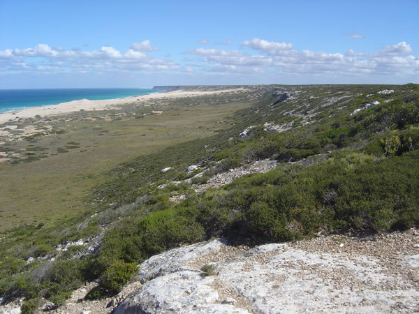 Eyre Highway, NullaborWe travelled east from Eucla to the first of the series of lookouts easily accessible from the Eyre Highway. This is the view you get as you look back towards Eucla which is just passed the cliffs in the distance. Previous | Album | Next |