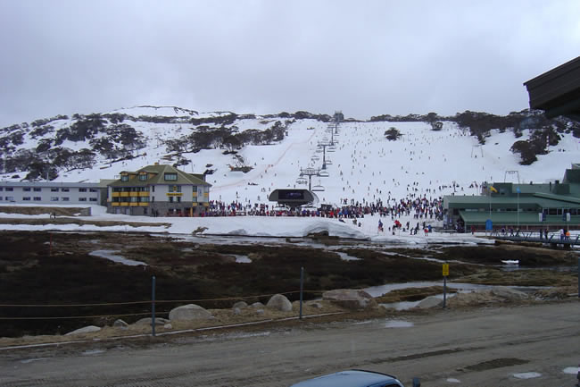 Ski Trip to Perisher Blue, New South WalesWe drove from Brisbane to Sydney stopping at Red Rock River for one of our breaks (SEE photo). We stayed overnight with relatives in Sydney, then off to Jindabyne to pick up our ski gear and park the car at Bullocks Flat (secure patrolled parking). It started to snow very lightly as we boarded the Ski Tube to Perisher. This photo is taken as we leave the station at Perisher. Still plenty of snow for skiing on the runs but pretty scarce in the township of Perisher itself.Select the photo below to see how it looked the next day!!! Previous | Album | Next |