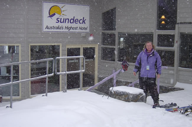 Ski Trip to Perisher Blue, New South WalesThe snow starts in earnest!! We arrived Sunday in time for the free afternoon skiing. It started to snow lightly that afternoon and continued off and on for the next few days which was great. The ski drying room opened to the outside just off to the left of this photo so it was a matter of skiing onto the verandah, removing your skis and walking into the room where you left your ski boots and other gear and swapping your boots for your comfy lambswool slippers (in my case!) Previous | Home | Next |